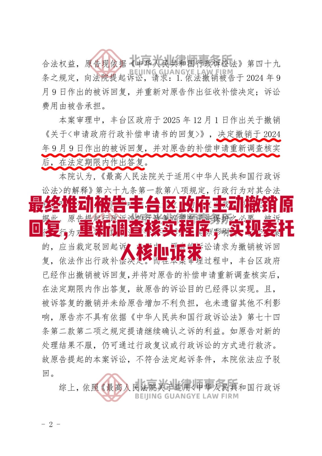 最终成功推动丰台区政府主动撤销原回复,启动重新调查核实程序,实现委托人核心诉求。