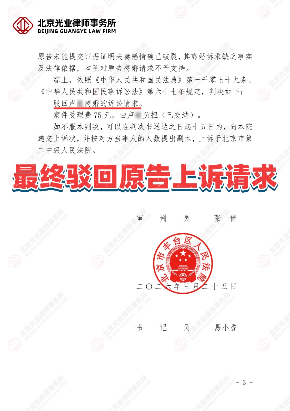 最终,法院采纳了我们的意见,驳回了原告的离婚诉讼请求,从签约到结案只用了仅仅15天!